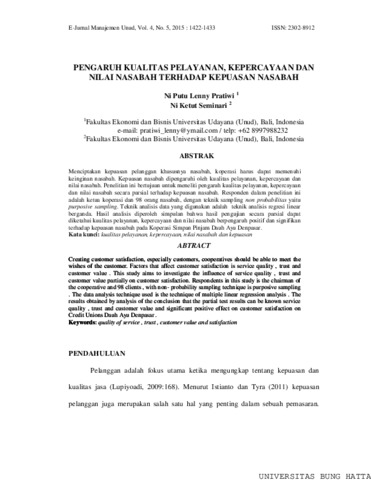 PENGARUH KUALITAS PELAYANAN, KEPERCAYAAN DAN NILAI NASABAH TERHADAP KEPUASAN NASABAH Ni Putu Lenny Pratiwi 1 Ni Ketut Seminari 2 1Fakultas Ekonomi dan Bisnis Universitas Udayana (Unud), Bali, Indonesia e-mail: pratiwi_lenny@ymail.com / telp: +62 8997988232 2Fakultas Ekonomi dan Bisnis Universitas Udayana (Unud), Bali, Indonesia ABSTRAK Menciptakan kepuasan pelanggan khususnya nasabah, koperasi harus dapat memenuhi keinginan nasabah. Kepuasan nasabah dipengaruhi oleh kualitas pelayanan, kepercayaan dan nilai nasabah. Penelitian ini bertujuan untuk meneliti pengaruh kualitas pelayanan, kepercayaan dan nilai nasabah secara parsial terhadap kepuasan nasabah. Responden dalam penelitian ini adalah ketua koperasi dan 98 orang nasabah, dengan teknik sampling non probabilitas yaitu purposive sampling. Teknik analisis data yang digunakan adalah teknik analisis regresi linear berganda. Hasil analisis diperoleh simpulan bahwa hasil pengujian secara parsial dapat diketahui kualitas pelayanan, kepercayaan dan nilai nasabah berpengaruh positif dan signifikan terhadap kepuasan nasabah pada Koperasi Simpan Pinjam Dauh Ayu Denpasar. Kata kunci: kualitas pelayanan, kepercayaan, nilai nasabah dan kepuasan