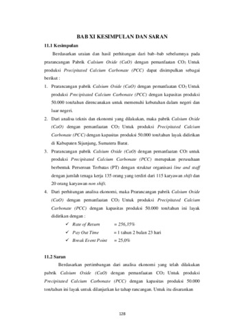 Pabrik Calsium Oxide (CaO) dengan pemanfaatan CO2 Untuk produksi Precipitated Calcium Carbonate (PCC) dengan kapasitas produksi 50.000 ton/tahun. Pabrik ini akan di dirikan di Kabupaten Sijunjung, Sumatera Barat. Dasar dari pemilihan lokasi ini adalah dari analisa Strength, Weakness Opportunities, dan Threat (SWOT) dari berbagai aspek, yaitu ketersediaan bahan baku, pemasaran, transportasi, tenaga kerja, utilitas, dan iklim. Pabrik ini beroperasi selama 300 hari per tahun. Proses pembuatan Calsium Oxide (CaO) dengan pemanfaatan CO2 Untuk produksi Precipitated Calcium Carbonate (PCC) dilakukan dengan tiga tahap yaitu tahap pembentukan CaO, tahap pembentukan PCC dan tahap pemurnian PCC. Hasil analisa ekonomi menunjukan bahwa pabrik ini layak untuk didirikan dengan jumlah investasi sebesar US$ 78.137.561 yang diperoleh dari pinjaman bank 50% dan modal sendiri 50%. Laju Pengembalian Modal (ROR) sebesar 114,23%, waktu pengembalian modal (POT) adalah 1 tahun 2 bulan dan Titik Impas (BEP) sebesar 38,2 %.