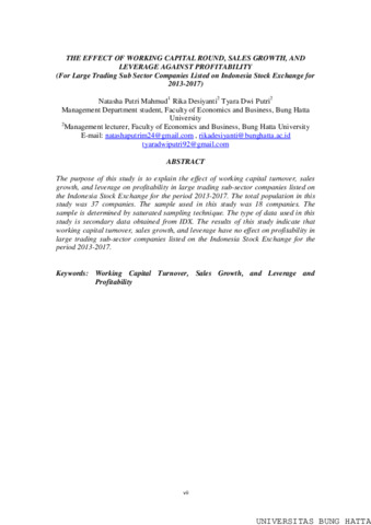 PENGARUH PERPUTARAN MODAL KERJA, PERTUMBUHAN PENJUALAN, DAN LEVERAGE TERHADAP PROFITABILITAS (Pada Perusahaan Sub Sektor Perdagangan Besar yang terdaftar di Bursa Efek Indonesia Periode 2013-2017) Natasha Putri Mahmud1 Rika Desiyanti2 Tyara Dwi Putri2 Mahasiswa Jurusan Manajemen, Fakultas Ekonomi dan Bisnis, Universitas Bung Hatta 2Dosen Manajemen, Fakultas Ekonomi dan Bisnis, Universitas Bung Hatta E-mail: natashaputrim24@gmail.com , rikadesiyanti@bunghatta.ac.id tyaradwiputri92@gmail.com ABSTRAK Tujuan penelitian ini adalah untuk menjelaskan pengaruh perputaran modal kerja, pertumbuhan penjualan, dan leverage terhadap profitabilitas pada perusahaan sub sektor perdagangan besar yang terdaftar di Bursa Efek Indonesia periode 2013- 2017. Total populasi dalam penelitian ini adalah 37 perusahaan. Sampel yang digunakan dalam penelitian ini adalah 18 perusahaan. Sampel ditentukan dengan teknik sampling jenuh. Jenis data yang digunakan dalam penelitian ini berupa data sekunder yang diperoleh dari IDX. Hasil dari penelitian ini menunjukkan bahwa perputaran modal kerja, pertumbuhan penjualan, dan leverage tidak berpengaruh terhadap profitabilitas pada perusahaan sub sektor perdagangan besar yang terdaftar di Bursa Efek Indonesia periode 2013-2017. Kata kunci: Perputaran Modal Kerja, Pertumbuhan Penjualan, Leverage dan Profitabilitas