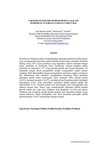 ADE, MIRANTI AZHARI and Pebriyenni, Pebriyenni and Yusrizal, Yusrizal (2020) PARTISIPASI POLITIK PEMILIH PEMULA DALAM PEMILIHAN WALIKOTA PADANG TAHUN 2018. Diploma thesis, UNIVERSITAS BUNG HATTA.
