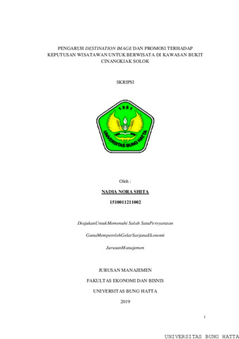 PENGARUH DESTINATION IMAGE DAN PROMOSI TERHADAP KEPUTUSAN WISATAWAN BERKUNJUNG UNTUK BERWISATA DI KAWASAN BUKIT CINANGKIAK SOLOK Nadia Nora Shita1, Irda2, Lindawati3 Jurusan Manajemen, Fakultas Ekonomi dan Bisnis Universitas Bung Hatta Dosen Jurusan Manajemen, Fakultas Ekonomi, Universitas Bung Harta Email : nadianoraaa@gmail.com , irda1987@yahoo.com , lindawati@bunghatta.ac.id ABSTRAK Penelitian ini bertujuan untuk mengetahui pengaruh destination image dan promosi terhadap keputusan berkunjung untuk berwisata di kawasan Bukit Cinangkiak Solok. Sampel dalam penelitian ini adalah wisatawan yang berkunjung pada objek wisata Bukit Cinangkiak Solok yang berjumlah 100 orang dengan teknik pengambilan sampel purposive sampling. Jenis data dalam penelitian ini adalah data primer dari hasil penyebaran kuisioner. Metode analisa yang digunakan adalah analisi regresi linier berganda. Hasil penelitian ini menemukan bahwa destination image berpengaruh positif dan signifikan terhadap keputusan wisatawan berkunjung pada objek wisata Bukit Cinangkiak Solok, sementara promosi tidak berpengaruh signifikan terhadap keputusan wisatawan berkunjung pada Objek Wisata Bukit Cinangkiak Solok. Kata kunci: Destination Image, Promosi dan Keputusan berkunjung
