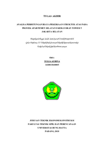 Yulia, Audina and Zulherman, Zulherman and Fielda, Roza (2018) ANALISA PERHITUNGAN BIAYA PEKERJAAN STRUKTUR ATAS PADA PROYEK APARTEMEN SELATAN 8 KEBAYORAN TOWER T JAKARTA SELATAN. Diploma thesis, Universitas Bung Hatta.