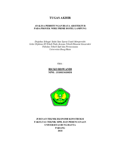 Ricko, Riswandi and Dwifitra, Y Jumas and Wahyudi, P. Utama (2018) ANALISA PERHITUNGAN BIAYA ARSITEKTUR PADA PROYEK WHIZ PRIME HOTEL LAMPUNG. Diploma thesis, Universitas Bung Hatta.
