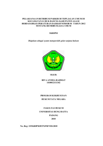PELAKSANAAN RETRIBUSI PARKIR DI TEPI JALAN UMUM DI KECAMATAN LUBUK BASUNG KABUPATEN AGAM BERDASARKAN PERATURAN DAERAH NOMOR 01 TAHUN 2012 TENTANG RETRIBUSI JASA UMUM Riva Annisa Rahmat 1 Program Studi Hukum, Fakultas Hukum Universitas Bung Hatta , Dr. Sanidjar Pebrihariati. R, SH.MH 1 , Suamperi, SH.MH 1 E-mail : rivaannisa25@gmail.com ABSTRAK 1 Retribusi adalah pungutan oleh pejabat retribusi kepada wajib retribusi yang bersifat memaksa dengan tegenprestasi secara langsung dan dapat dipaksakan penagihannya, Pengertian retribusi Berdasarkan Peraturan Daerah Kabupaten Agam Nomor 01 tahun 2012 Tentang Retribusi Jasa Umum Pasal 1, adalah pemungutan daerah sebagai pembayaran atas jasa atau pemberian izin tertentu yang khusus disediakan dan/atau diberikan oleh pemerintah kabupaten untuk kepentingan pribadi atau badan. retribusi sangat dibutuhkan oleh Negara dalam angka untuk memberikan pelayanan secara langsung kepada masyarakat.Rumusan masalah1) Tugas dan Wewenang Dinas Perhubungan Kabupaten Agam dalam pelaksanaan retribusi parkir di tepi jalan umum, 2)Kendala-kendala yang di hadapi Dinas Perhubungan Kabupaten Agam dalam pelaksanaan retribusi di tepi jalan umum 3)Upaya-upaya yang dilakukan Dinas Perhubungan Kabupaten Agam dalam pelaksanaan retribusi parkir di tepi jalan umum. Metode Penelitian yang digunakan penulis dalam penelitian ini adalah Metode Penelitian Sosiologis yaitu dengan menggunakan studi dokumen dan wawancara sebagai sumber data. Hasil dari penelitian adalah : 1) pelaksanaan retribusi parkir di tepi jalan umum di Kecamatan Lubuk Basung Kabupaten Agam dapat disimpulkan bahwa pelaksanaan retribusi parkir di tepi jalan umum baik dilihat dari segi pemeriksaan, pengawasan sudah efektif, namun masih ada yang harus perlu diperbaiki terutama lebih meningkatkan pengawasan serta bimbingan kepada tukang parkir 2) faktor yang menghambat pelaksanaan retribusi parker disebabkan oleh sulitnya mengumpulkan petugas parkir agar dapat diberi arahan dalam melaksanakan tugas 3) upaya yang dilakukan Dinas Perhubungan adalah terus meningkatkan pengawasan kepada petugas parkir. Kata kunci : Retribusi Parkir, Dinas Perhubungan, Peraturan Daerah