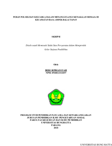 Deri, Sepriansyah and Yusrizal, Yusrizal and NURHARMI, NURHARMI (2018) PERANAN POLSEK DAN KELUARGA DALAM MENANGGULANGI KENAKALAN REMAJA DI KECAMATAN BASA AMPEK BALAI TAPAN. Diploma thesis, Universitas Bung Hatta.