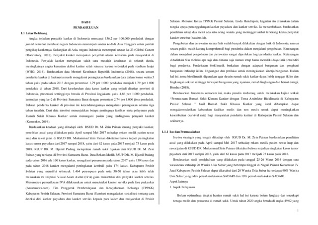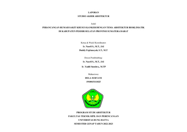 Suryani, Dela and Sikumbang, Nasril and Sumitra, Yaddi (2023) PERANCANGAN RUMAH SAKIT KHUSUS KANKER DENGAN TEMA ARSITEKTUR BIOKLIMATIK DI KABUPATEN PESISIR SELATAN PROVINSI SUMATERA BARAT. Diploma thesis, Universitas Bung Hatta.