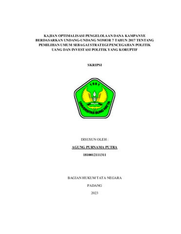 Agung, Purnama Putra and Boy Yendra, Tamin (2023) KAJIAN OPTIMALISASI PENGELOLAAN DANA KAMPANYE BERDASARKAN UNDANG-UNDANG NOMOR 7 TAHUN 2017 TENTANG PEMILIHAN UMUM SEBAGAI STRATEGI PENCEGAHAN POLITIK UANG DAN INVESTASI POLITIK YANG KORUPTIF. Diploma thesis, Universitas Bung Hatta.