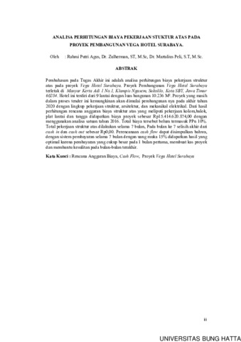 Rahmi, Putri Agus and Zulherman, Zulherman and Martalius, Peli (2020) ANALISA PERHITUNGAN BIAYA PEKERJAAN STUKTUR ATAS PADA PROYEK PEMBANGUNAN VEGA HOTEL SURABAYA. Diploma thesis, Universitas Bung Hatta.