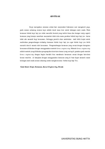Kopi merupakan minuma sehari-hari masyarakat Indonesia saat mengawali pagi, pada zaman sekarang minum kopi adalah trend masa kini untuk kalangan anak muda. Pada kemasan bubuk kopi haji yos tidak memiliki bentuk yang terlalu biasa dan hamper mirip seperti kemasan yang lainnya membuat masyarakat tidak tahu mana pembua bubuk kopi haji yos karna tidak ada menarik bagi konsumen. Sehingga peneliti akan melakukan studi lebih lanjut untuk melakukan pengembangan terhadap kemasan bubuk kopi haji yos agar bubuk kopi yos lebih menarik dan di manati oleh konsumen. Pengemabangan kemasan yang sesuai dengan keinginan konsumen dilakukan dengan menggunakan metode kensei engineering. Metode kensei engineering adalah metode yang dilakukan pengumpulan kata-kata kensei yang sering di gunakan pada metode kensei engineering dengan begitu barulah bisa mendesain kemassan sesuai dengan kata-kata kensei tersebut . di harapkan dengan menggunakan kemasan yang di buat dapat menarik minat kalangan anak muda zaman sekarang untuk mengkomsumsi bubuk kopi haji Yos. Kata Kunci :Kopi, Kemasan, Kansei Engineering, Desain