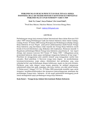 PERLINDUNGAN HUKUM PENUTUTAN HAK TENAGA KERJA INDONESIA DI LUAR NEGERI MENURUT KONVENSI ILO MENGENAI PERLINDUNGAN UPAH NOMOR 97 TAHUN 1949 Dede Try Utama 1 1 , Surya Prahara , Dwi Astuti Palufi 1 , 1 Prodi Ilmu Hukum, Fakulitas Hukum, Universitas Bungg Hatta Email : dedetry18@gmail.com ABSTRAK Perlindunggan tenaga kerja menurut hukum Internasional diatur dalam Konvensi ILO tahun 1949 tentang Perlindungan Upah dan hukum Indonesia diatur dalam UndangUndang Nomor 39 Tahun 2004 tentang Penetapan dan Perlindungan terhadap Tenaga Kerja Indonesia di Luar Negeri. pada proses pelaksanaannya masih banyak Tenaga Kerja Indonesia yang hak-haknya tidak terjamin dan Tenaga Kerja Indonesia masih berada di bawah diskriminasi yang dilakukan oleh majikannya. Rumusan masalah 1) Bagaimana perlindungan Hukum Tenaga kerja Indonesia yang bekerja di luar negeri ditinjau dari menurut konvensi ILO Nomor 97 Tahun 1949 ? 2)Bagaimana peran pemerintah Indonesia dalam upaya melindungi tenagakerja Indonesia di luar neger ? Penelitian ini menggunakan jenis peneliti nomatif yang menggunkan sumber data sekunder. Hasil penelitian 1) Konvensi tenaga kerja migran ini memberlakukan ketentuan-ketentuannya tanpa adanya diskiriminasi dan perlakukan yang sama terhadap hal-hal yang berhubungan dengan kebebasaan, ragam ras dan jenis kelamin. Perlakuan yang sama dengan warga negara penerima ini meliputi pengawasan administratif antara lain upah, tunjangan, jam kerja, lembur, usia mini untuk bekerja. 2) Dalam pasal 5 hingga7 UU No. 39 Tahun 2004 pemerintah memiliki tugas untuk mengatur, membina,melaksanakan dan mengawasi pennyelenggaraan penetapan dan perlindungan Tenaga kerja Indonesia di luar negeri pemerintah bertanggung jawab untuk meningkatkan upaya perlindungan tenaga kerja Indonesia. Kata Kunci : Tenaga kerja, hukum Internasional, Hukum Indonesia