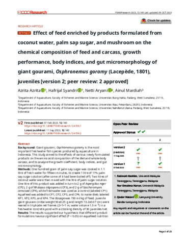 Azrita, Azrita BK_RE1_Effect of feed enriched by products formulated from coconut water, palm sap sugar, and mushroom on the chemical composition of feed and carcass, growth performance, body indices, and gut micromorphology of giant gourami, Osphronemus goramy (Lacepède, 1801), juveniles. F1000Research. ISSN 20461402