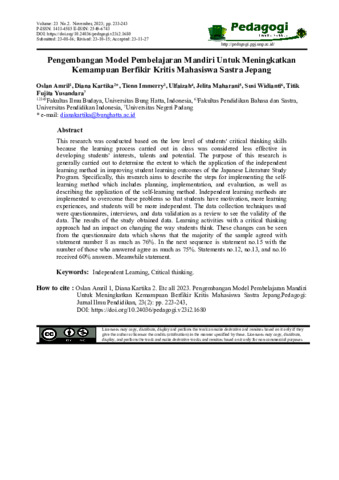 Diana, Kartika Pengembangan Model Pembelajaran Mandiri Untuk Meningkatkan Kemampuan Berfikir Kritis Mahasiswa Sastra Jepang. Pengembangan Model Pembelajaran Mandiri Untuk Meningkatkan Kemampuan Berfikir Kritis Mahasiswa Sastra Jepang.