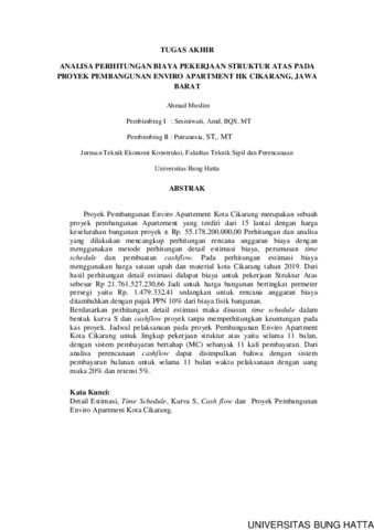 Ahmad, Muslim and Sesmiwati, Sesmiwati and Putranesia, Putranesia (2020) ANALISA PERHITUNGAN BIAYA PEKERJAAN STRUKTUR ATAS PADA PROYEK PEMBANGUNAN ENVIRO APARTMENT HK CIKARANG, JAWA BARAT. Diploma thesis, Universitas Bung Hatta.