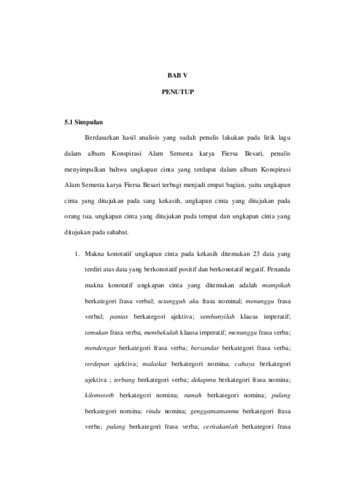 ABSTRAK Makna merupakan hasil dari pikiran ketika membaca atau melihat sebuah teks atau tulisan, sedangkan makna konotatif adalah makna yang memuat nilai rasa di dalam nya. Penelitian ini bertujuan untuk mendeskripsikan makna konotatif ungkapan cinta yang terdapat dalam album Konspirasi Alam Semesta karya Fiersa Besari. Metode yang digunakan adalah metode deskriptif. Untuk pengumpulan data digunakan metode simak dan teknik catat. Selanjutnya, untuk menganalisis data digunakan metode agih dengan teknik bagi unsur langsung dan teknik baca markah. Berdasarkan hasil penelitian ditemukan bentuk ungkapan cinta yang terbagi menjadi empat bagian, yaitu: (1) makna ungkapan cinta pada kekasih, (2) makna ungkapan cinta pada orang tua, (3) makna ungkapan cinta pada tempat, dan (4) makna ungkapan cinta pada sahabat. Makna konotatif yang ditemukan ada dua yaitu makna konotatif positif dan makna konotatif negatif. Kata kunci: Makna konotatif, Ungkapan cinta, Album Konspirasi Alam Semesta.