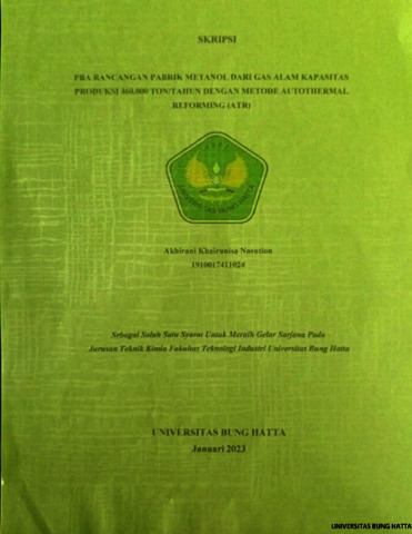 akhiranikhairunisa, nasution and Pasymi, pasymi (2024) Pra Rancangan Pabrik Metanol dari Gas Alam Dengan Metode Autothermal Reforming dengan Kapasitas 460.000 ton/tahun. Diploma thesis, Universitas Bung Hatta.
