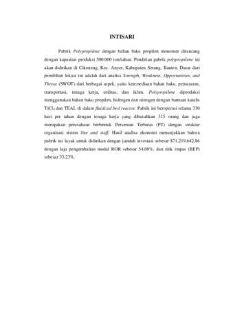 Pabrik Polypropilene dengan bahan baku propilen monomer dirancang dengan kapasitas produksi 500.000 ton/tahun. Pendirian pabrik polypropilene ini akan didirikan di Cikoneng, Kec. Anyer, Kabupaten Serang, Banten. Dasar dari pemilihan lokasi ini adalah dari analisa Strength, Weakness, Opportunities, and Threat (SWOT) dari berbagai aspek, yaitu ketersediaan bahan baku, pemasaran, transportasi, tenaga kerja, utilitas, dan iklim. Polypropilene diproduksi menggunakan bahan baku propilen, hidrogen dan nitrogen dengan bantuan katalis TiCl4 dan TEAL di dalam fluidized bed reactor. Pabrik ini beroperasi selama 330 hari per tahun dengan tenaga kerja yang dibutuhkan 315 orang dan juga merupakan perusahaan berbentuk Perseroan Terbatas (PT) dengan struktur organisasi sistem line and staff. Hasil analisa ekonomi menunjukkan bahwa pabrik ini layak untuk didirikan dengan jumlah investasi sebesar $71.219.642,86 dengan laju pengembalian modal ROR sebesar 54,08%, dan titik impas (BEP) sebesar 33,23%
