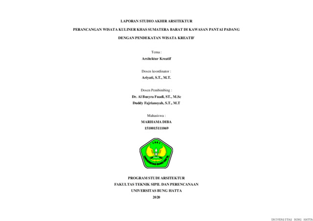 Marhama, Diba and Al Busyra, Fuadi and Duddy, Fajriansyah (2020) PERENCANAAN WISATA KULINER KHAS SUMATERA BARAT DI KAWASAN PANTAI PADANG DENGAN PENDEKATAN WISATA KREATIF. Diploma thesis, UNIVERSITAS BUNG HATTA.