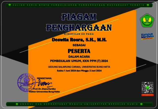 Deswita, Rosra (2024) SERTIFIKAT PESERTA PEMBEKALAN UMUM-DESWITA ROSRA. Universitas Bunghatta.