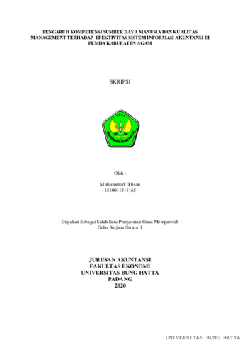 PENGARUH KOMPETENSI SUMBER DAYA MANUSIA DAN KUALITAS MANAGEMENT TERHADAP EFEKTIVITAS SISTEM INFORMASI AKUNTANSI DI PEMDA KABUPATEN AGAM Muhammad Ikhsan1, Afrizon2, Dandes Rifa3 Jurusan Akuntansi Fakultas Ekonomi dan Bisnis Universitas Bung Hatta Email: muhammadikhsan7777@gmail.com ABSTRAK Penelitian ini bertujuan untuk mengetahui pengaruh kompetensi sumber daya manusia terhadap terhadap efektivitas sistem informasi akuntansi di Pemda Kabupate n Agam. Untuk mengetahui pengaruh kualitas manajemen terhadap terhadap efektivitas sistem informasi akuntansi di Pemda Kabupaten Agam. Untuk mengetahui pengaruh kompetensi sumber daya manusia dan kualitas manajemen terhadap terhadap efektivitas sistem info rmasi akuntansi di Pemda Kabupaten Agam. Penelitian dilakukan di Pemda Kabupaten Agam. Sampel Penelitian pegawai Satuan Kerja Perangkat Daerah Kabupaten Agam. Data yang digunakan dalam penelitian ini data primer. Metode pengumpulan data menggunakan kuisioner yang disebarkan kepada responden. Metode analisis data yang digunakan dalam penelitian ini adalah Regresi Berganda. Kompetensi SDM, dan kualitas management berpengaruh terhadap efektivitas sistem informasi akuntansi di Pemda Kabupaten Agam masih terdap at varians variabel terikat yang belum mampu dijelaskan oleh variabel bebas dalam model penelitian ini. Kata kunci: Kompetensi Sumber Daya Manusia, Kualitas Management Terhadap Efektivitas Sistem Informasi Akuntansi Pemda Kabupaten Agam.