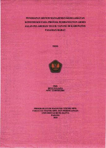 Revi, Yuliana and Nasfryzal, Carlo and Dwifitra, Y Jumas (2024) PENERAPAN SISTEM MANAJEMEN KESELAMATAN KONSTRUKSI PADA PROYEK PEMBANGUNAN AKSES JALAN PELABUHAN TELUK TAPANG DI KABUPATEN PASAMAN BARAT. Masters thesis, Universitas Bung Hatta.