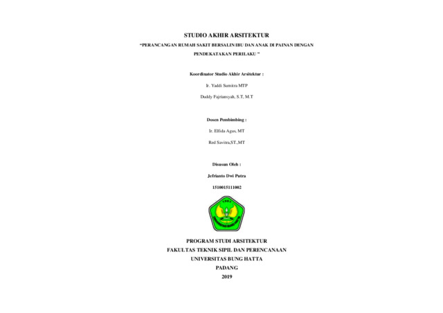 Jefrianto, Dwi Putra (2020) PERANCANGAN RUMAH SAKIT BERSALIN IBU DAN ANAK DI PAINAN DENGAN PENDEKATAKAN PERILAKU. Diploma thesis, UNIVERSITAS BUNG HATTA.