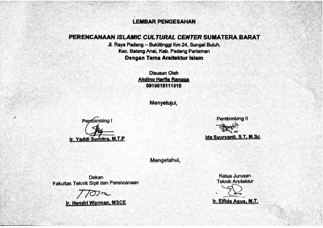Akdino, Harfia Rangga and Yaddi, Sumitra and Ida, Syuryanti (2015) PERENCANAAN ISLAMIC CULTURAL CENTER SUMATERA BARAT DI PADANG PARIAMAN DENGAN PENDEKATAN ARSITEKTUR ISLAM. Diploma thesis, Universitas Bung Hatta.
