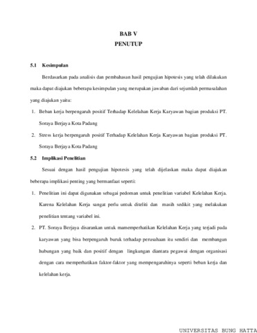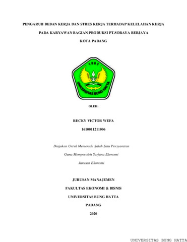 PENGARUH BEBAN KERJA DAN STRES KERJA TERHADAP KELELAHAN KERJA PADA KARYAWAN BAGIAN PRODUKSI PT.SORAYA BERJAYA KOTA PADANG Recky Victor Wefa1. Ice Kamela, S.E., M.M2. ElfitraAzliyanti, S.E., M.Sc3 Jurusan Manajemen, Fakultas Ekonomi Dan Bisnis, Universitas Bung Hatta E-mail: reckywefa@gmail.com ABSTRAK Penelitian ini menguji hubungan antara pengaruh beban kerja dan stres kerja terhadap kelelahan kerja pada karyawan bagian produksi PT.Soraya Berjaya Kota Padang. Responden dalam penelitian ini adalah karyawan bagian produksi PT soraya Berjaya Kota Padang. Penelitian ini menggunakan metode field reseach yaitu metode pengumpulan data yang melibatkan peneliti secara langsung untuk turun ke lapangan agar dapat mengumpulkan informasi dan data yang diperlukan dalam penelitian ini. Responden pada penelitian ini sebanyak 55 orang dengan factor loading 0.50. Hasil penelitian menunjukkan bahwa hipotesis 1)Beban Kerja berpengaruh positif terhadap Kelelahan Kerja. 2)Stres Kerja berpengaruh negatif terhadap Kelelahan Kerja. Nilai koefisien regresi pada Beban Kerja sebesar 0,397 bertanda positif. Nilai Tstatistik 2,047 dan nilai signifikan 0.046.keputusan hipotesis diterima sedangkan nilai koefisien regresi pada Stres Kerja sebesar 0.567 bertanda positif. Nilai Tstatistik5.596 dan nilai signifikan 0.000. keputusan hipotesis diterima. Kata kunci : Kelelahan Kerja, Beban Kerja, Stress Kerja.