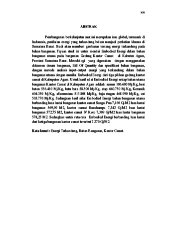 Pembangunan berkelanjutan saat ini merupakan issu global, termasuk di Indonesia, penilaian energi yang terkandung belum menjadi perhatian khusus di Sumatera Barat. Studi akan memberi gambaran tentang energi terkandung pada bahan bangunan. Tujuan studi ini untuk menilai Embodied Energi dalam bahan bangunan utama pada bangunan Gedung Kantor Camat di Kabuten Agam, Provinsi Sumatera Barat. Metodologi yang digunakan dengan menggunakan dokumen desain bangunan, Bill Of Quantity dan spesifikasi bahan bangunan, dengan metode analisis input-output energi yang terkandung dalam bahan bangunan utama dengan menilai Embodied Energi dari tiga pilihan gedung kantor camat di Kabupaten Agam. Untuk hasil nilai Embodied Energi setiap bahan utama bangunan Kantor Camat di Kabupaten Agam adalah: semen 106.600 Mj/Kg, besi beton 556.410 Mj/Kg, batu bata 58.500 Mj/Kg, atap 660.750 Mj/Kg, Keramik 604.350 Mj/Kg, allumunium 513.808 Mj/Kg, baja ringan 468.990 Mj/Kg, cat 503.770 Mj/Kg. Sedangkan hasil nilai Embodied Energi bahan bangunan utama berbanding luas lantai bangunan kantor camat Sungai Pua 7,160 Gj/M2 luas lantai bangunan 569,90 M2, kantor camat Banuhampu 7,342 Gj/M2 luas lantai bangunan 572,75 M2, kantor camat IV Koto 7,309 Gj/M2 luas lantai bangunan 578,25 M2. Sedangkan untuk rata-rata Embodied Energi berbanding luas lantai dari ketiga bangunan kantor camat tersebut 7,270.Gj/M2. Kata kunci : Energi Terkandung, Bahan Bangunan, Kantor Camat.