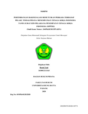 Resmi, Yani and Uning, Pratimaratri and Helmi, Chandra (2020) PERTIMBANGAN HAKIM DALAM MEMUTUSKAN PERKARA TERHADAP PELAKU TINDAK PIDANA TURUT MELAKUKAN PERBUATAN MENEMPATKAN WNI UNTUK BEKERJA DI LUAR NEGERI SECARA ORANG PERSEORANGAN. Diploma thesis, UNIVERSITAS BUNG HATTA.