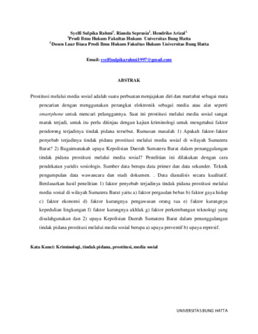 Syelfi, Sulpika Rahmi and Rianda, Seprasia and Hendriko, Arizal (2020) ANALISIS KRIMINOLOGI TERHADAP PRAKTIK PROSTITUSI MELALUI MEDIA SOSIAL DI WILAYAH SUMATERA BARAT SKRIPSI. Diploma thesis, UNIVERSITAS BUNG HATTA.