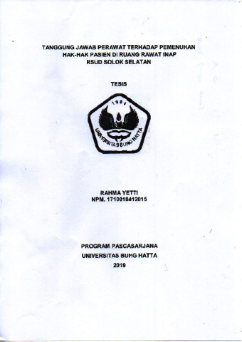 Rahma, Yetti and Zarfinal, Zarfinal and Maiyestati, Maiyestati (2021) TANGGUNG JAWAB PERAWAT TERHADAP PEMENUHAN HAK-HAK PASIEN DI RUANG RAWAT INAP RSUD SOLOK SELATAN. Masters thesis, UNIVERSITAS BUNG HATTA.