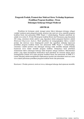 OKTA, NOVIA and Syafrizal, Chan and Sefnedi, Sefnedi (2021) Pengaruh Produk, Promosi dan Motivasi Siswa Terhadap Keputusan Pemilihan Program Keahlian : Peran Dukungan Keluarga Sebagai Moderasi. Masters thesis, UNIVERSITAS BUNG HATTA.