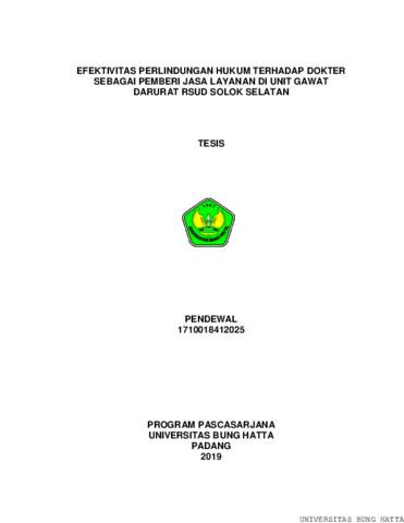 Pendewal, Pendewal and Darmini, Roza and Uning, Pratimaratri (2021) EFEKTIVITAS PERLINDUNGAN HUKUM TERHADAP DOKTER SEBAGAI PEMBERI JASA LAYANAN DI UNIT GAWAT DARURAT RSUD SOLOK SELATAN. Masters thesis, UNIVERSITAS BUNG HATTA.