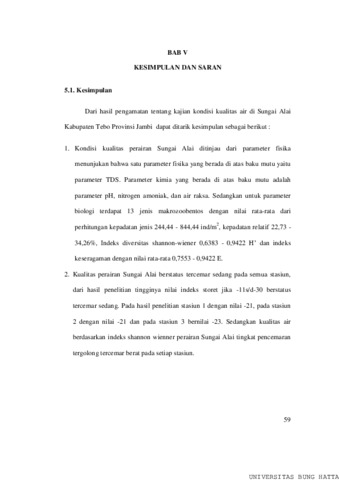 RINGKASAN Madinathul Islamiyah NPM 1510018112003. Kajian Kualitas Air Sungai Alai Kabupaten Tebo Provinsi Jambi, di bawah bimbingan Bapak Dr. Ir. Abdullah Munzir, M.Si dan Bapak Dr. Ir. Suparno, M.Si. Sungai Alai merupakan salah satu perairan yang terdapat di KabupatenTebo yang melintasi 4 kecamatan yaitu Kecamatan Rimbo Bujang, Kecamatan Rimbo Ilir, Kecamatan Tebo Ulu dan Kecamatan Tebo Tengah. Sungai ini adalah anak sungai dari Sungai Batanghari yang bermuara ke Sungai Batang Tebo. Perairan Sungai Alai dimanfaatkan masyarakat sekitar perairan untuk usaha penangkapan ikan sebagai mata pencarian, mengaliri pertanaman dan pembuangan limbah rumah tangga. Pada tahun 2004 berdiri Pabrik Industri Kelapa Sawit yang lebih dikenal PT BTP 6, pada tahun 2010 mulai terdapat aktivitas Penambangan Emas Tanpa Izin ( PETI ). Perairan Sungai Alai telah tercemar. Sumber pencemarannya adalah Penambangan Emas Tanpa Izin (PETI). Di samping itu juga terdapat pengaruh pabrik sawit yang membuang limbah ke Sungai Alai. Akibat dari kegiatan tersebut, terlihat air sungai sangat keruh berwarna kecoklatan pekat (lumpur) dan berdampak terhadap menurunnya kualitas air yang akan mengancam kelestarian habitat atau ekosistem perairan sungai tersebut. Tujuan penelitian pada bulan Juni – September 2017 untuk menganalisis parameter fisika, kimia dan biologi perairan di lokasi penelitian. Parameter yang dianalisis adalah 11 parameter fisika dan kimia yaitu parameter suhu,kecerahan, TSS, TDS, pH, BOD5, COD, nitrogen amoniak, air raksa, timbal, minyak dan lemak. Untuk parameter biologi air pengambilan sampel melalui indikator keberadaan makrozoobentos dengan menngunakan alat Ekman Dredge ukuran 30 x 30. Pengambilan sampel air dilakukan dengan 2 kali ulangan untuk sampel yang dibawa ke labotaroriun Balai Laboratorium Dinas Kesehatan Provinsi Sumatera Barat dan untuk parameter biologi diuji di laboratorium Biologi Universitas Bung Hatta, dan 3 kali ulangan untuk sampel yang dilakukan di lapangan. Cara penentuan stasiun digunakan metode purposive sampling. Pengambilan sampel di stasiun ditentukan berdasarkan kecepatan arus sungai pada stasiun 1 bagian hulu sungai, stasiun 2 bagian tengah sungai dan stasiun 3 bagian hilir sungai. waktu pengambilan adalah pukul 06.00 WIBs.d 10:00 WIB. Penelitian ini merupakan penelitian deskritif dengan pendekatan kuantitatif dan kualitatif. Status kualitas air Sungai Alai ditetapkan dengan menggunakan Metode STORET. Pada prinsipnya metode ini membandingkan atara data kualitas dengan baku mutu yang disesuaikan dengan peruntukannya guna menentukan status mutu air. Perairan Sungai Alai peruntukannya adalah kelas III PP 82 Tahun 2001. Penentuan status mutu air adalah denga nmenggunakan system nilai dari “US-EPA (United Stated – Enviromental Protection Agency). Untuk mengetahui jenis makrozoobentos maka akan diambil dibeberapa titik lokasi ataus tasiun yang telah ditentukan. Data yang diperoleh diolah dengan menghitung kepadatan jenis, kepadatan relatif, indeks diversitas Shannon dan wiener, indeks seseragaman. Dari hasil penelitian kondisi kualitas perairan Sungai Alai ditinjau dari parameter fisika masih berada di bawah batas baku mutu air dengan perolehan nilai rata-rata suhu 27,7-28,3 C, kecerahanair 26,6-50 cm, dan TSS 52-140 mg/l. Terdapat satu parameter yang berada di atas baku mutu dengan nilai TDS 1.605- 0 viii UNIVERSITAS BUNG HATTA 1.707 mg/l. Parameter kimia yang berada di bawah baku mutu memperoleh nilai rata-rata kisaran BOD5 1,5-2,6 mg/l, COD 8,1-15,2 mg/l, timbal0,002 mg/l, minyak dan lemak 0,1 mg/l, terdapat juga beberapa parameter berada di atas baku mutu dengan nilai rata-rata pH 5-5,3, nitrogen amoniak 0,0225-0,0370 mg/l, dan air raksa 0,68 mg/l. Sedangkan untuk parameter biologi terdapat 13 jenis makrozoobentos dengan nilai rata-rata dari perhitungan kepadatan jenis 244,44 - 844,44 ind/m 2 , kepadatan relatif 22,73-34,26 %, Indeks diversitas shannon-wiener 0,6383 - 0,9422 H’ dan indeks keseragaman dengan nilai rata-rata 0,7553 - 0,9422 E. Hasil penelitian ini menunjukkan bahwa kualitas perairan Sungai Alai berstatus tercemar sedang pada semua stasiun, terbukti tingginya nilai indeks storet jika -11s/d-30 berstatus tercemar sedang. Pada hasil penelitian stasiun 1 dengan nilai -21, pada stasiun 2 dengan nilai -21 dan pada stasiun 3 bernilai -23. Sedangkan kualitas air berdasarkan indeks shannon wienner perairan Sungai Alai tingkat pencemaran tergolong tercemar berat pada setiap stasiun dengan nilai H’ <1,0. Pada stasiun 1 dengan nilai H’ 0,6383, pada stasiun 2 dengan nilai H’ 0,9422 dan pada stasiun 3 dengan nilai H’ 0,881.