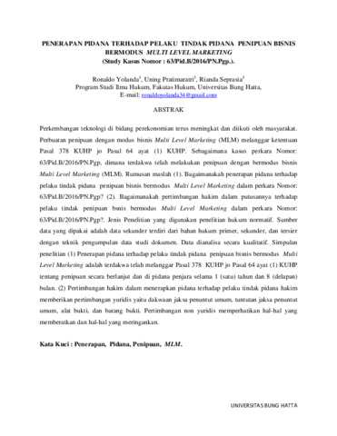Ronaldo, Yolanda and Uning, Pratimaratri and Rianda, Seprasia (2020) PENERAPAN PIDANA TERHADAP PELAKU TINDAK PIDANA PENIPUAN BISNIS BERMODUS MULTI LEVEL MARKETING. Diploma thesis, UNIVERSITAS BUNG HATTA.