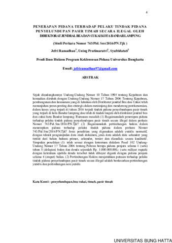 Jefri, Ramadhan and Uning, Pratimaratri and Syafridatati, Syafridatati (2021) PENERAPAN PIDANA TERHADAP PELAKU TINDAK PIDANA PENYELUNDUPAN PASIRTIMAH SECARA ILEGAL OLEH DIREKTORAT JENDRAL BEA DAN CUKAI KOTA BANDAR LAMPUNG. Diploma thesis, Universitas Bung Hatta.