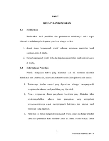 Penelitian ini bertujuan untuk mengetahui Pengaruh Brand Image, Dan Harga Terhadap Keputusan Pembelian Produk Hand Sanitizer Antis Di Siteba. Sampel dalam penelitian ini adalah konsumen yang melakukan pembelian produk hand sanitizer Antis di Siteba yang berjumlah 60 orang responden. Teknik pengambilan sampel yang digunakan yaitu Purposive Sampling. Jenis data yang digunakan pada penelitian adalah data primer. Pada penelitian ini menggunakan teknik analisis data yaitu regresi linear berganda dan uji hipotesis dengan menggunakan uji t-statistik. Hasil penelitian ini menemukan bahwa Brand Image berpengaruh positif terhadap Keputusan Pembelian hand sanitizer Antis, dan Harga berpengaruh positif terhadap Keputusan Pembelian hand sanitizer Antis.
