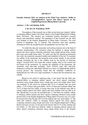 Zahrani, Fauziah and Lely, Refnita and Welya, Roza (2020) An Analysis of the Third Year Students’ Ability in ChangingIndirect Speech into Direct Speech at the English Department ofBung Hatta University. Diploma thesis, UNIVERSITAS BUNG HATTA.