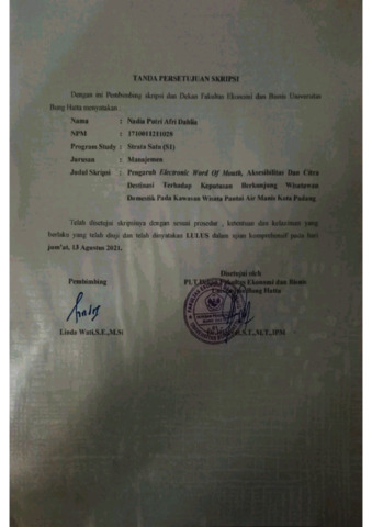 dahlia, Nadia putri afri and wati, Linda (2021) PENGARUH ELECTRONIC WORD OF MOUTH,AKSESIBILITAS DAN CITRA DESTINASI TERHADAP KEPUTUSAN BERKUNJUNG WISATAWAN DOMESTIK PADA KAWASAN WISATA PANTAI AIR MANIS KOTA PADANG. Diploma thesis, UNIVERSITAS BUNG HATTA.