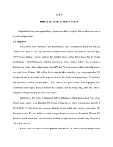ABSTRAK Emil Mahmud, 2021, Tesis “Analisis Wacana Kritis Model Teun A Van Dijk pada Pemberitaan TribunPadang.com: Debat Capres Jokowi dan Prabowo dalam Pilpres 2019”. Program Studi S2 Pendidikan Bahasa dan Sastra Indonesia, Fakultas Keguruan dan Ilmu Pendidikan Universitas Bung Hatta, Padang. Penelitian ini bertujuan untuk mendeskripsikan tentang debat capres Joko Widodo (Jokowi) dan Prabowo Subianto (PS) dalam Pilpres 2019 yang menyita perhatian publik. Berbagai media massa mulai cetak, elektronik hingga digital mempublikasikan secara online, serta menayangkan sajian pemberitaan seputar agenda politik di tanah air Indonesia.Selama ini konten pemberitaan dapat diperoleh melalui tontonan dan siaran televisi, radio, serta bacaan dari koran serta media online. Penelitian ini mengkaji struktur makro, mikro serta korelasi dari keduanya hingga ditemukannya superstruktur dari skema pemberitaan di media online TribunPadang.com. Penelitian ini menggunakan kerangka teoretis Analisa Wacana Kritis Model TeunA Van Dijkdan teori model Brown dan Yule (1996) tentang analisis teks. Penelitian ini menggunakan metode deskriptif kualitatif dengan mendeskripsikan analisis secara sistematis, akurat, faktual, mengenai fakta-fakta objek, yang dikaji sekaligus diteliti. Hasil penelitian ini menunjukkan bahwa sajian pemberitaan seputar debat capres Jokowi dan Prabowo dalam Pilpres 2019 belumlah sepenuhnya memenuhi superstruktur, layaknya skema artikel berita di media massa mainstream. Alasannya, masih ditemukan artikel pemberitaan yang belum berkorelasi atau kurang kesesuaian antara struktur makro, mikro yang ditinjau dari superstruktur misalnya, antara judul dan uraian teks beritanya. Hal ini lebih disebabkan tahapan produksi pemberitaan terbatas pada fakta saat debat capres, yang dilaporkan oleh wartawan. Alhasil, keterbatasan hasil reportase dari wartawan membuat editor sulit untuk menyunting atau mengedit agar menjadi artikel yang memenuhi superstruktur atau berkorelasi antara struktur makro dan mikro. Peneliti menemukan dari sepuluh artikel yang dijadikan sampel, ternyata hanya tiga artikel yang layak untuk dianalisis. Alasannya, ketiga artikel dimaksud memiliki struktur makro, mikro hingga adanya korelasi menjadi superstruktur. Berdasarkan hasil penelitian ini dapat disimpulkan bahwa analisis wacana kritis artikel pemberitaan debat capres Jokowi dan Prabowo pada Pilpres 2019 lebih mengutamakan struktur makro. Kendati teks berita yang elemen struktur mikro, lebih banyak ditemukan dalam artikel berita yang telah diteliti. Kata kunci: Analisis Wacana Kritis, Debat Capres, Struktur makro, Mikro, Superstruktu