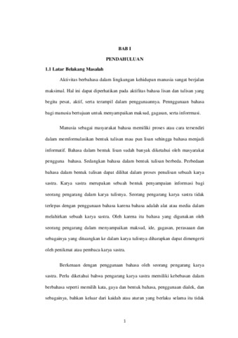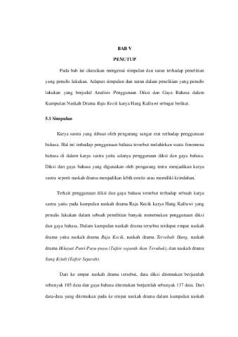 ABSTRAK Berlian Novriendi. Analisis Penggunaan Diksi dan Gaya Bahasa dalam Kumpulan Naskah Drama Raja Kecik karya Hang Kafrawi. Tesis. Padang. Program Studi Pascasarjana Pendidikan Bahasa dan Sastra Indonesia, Fakultas Keguruan dan Ilmu Pendidikan, Universitas Bung Hatta. 2021 Penelitian ini menganalisis penggunaan diksi dan gaya bahasa dalam kumpulan naskah drama Raja Kecik karya Hang Kafrawi. Tujuan penelitian ini untuk mendeskripsikan penggunaan diksi dan gaya bahasa serta mengetahui makna yang terkandung dalam kumpulan naskah drama Raja Kecik karya Hang Kafrawi serta fungsinya. Teori yang digunakan adalah teori diksi dari Gorys Keraf (2012) dan teori gaya bahasa dari Tarigan (2016). Metodologi penelitian adalah deskriptif kualitatif dengan langkah-langkah sebagai berikut: (1) membaca naskah drama, (2) mencatat dan mengklasifikasi data, (3) interpretasi, dan (4) menyimpulkan. Berdasarkan data penelitian diperoleh hasil bentuk-bentuk penggunaan diksi dan gaya bahasa dalam kumpulan naskah drama Raja Kecik karya Hang Kafrawi sebagai berikut: (1) bentuk penggunaan diksi ditemunkan sebanyak 185 data meliputi kata konotatif, kata denotatif, kata abstrak, kata umum, kata khusus, kata populer, kata ilmiah, kata jargon, kata slang, dan kata asing. (2) bentuk penggunaan gaya bahasa sebanyak 137 data meliputi gaya bahasa perbandingan diantaranya simile, metafora, dan alegori. Gaya bahasa pertentangan diantaranya hiperbola, ironi, dan paradoks. Gaya bahasa pertatutan diantaranya sinekdoke, alusi, dan antonomasia. Gaya bahasa perulangan diantaranya asonansi dan pertautan. Dari temuan diksi dan gaya bahasa dalam kumpulan naskah drama Raja Kecik karya Hang Kafrawi dilakukan penginterpretasian atau penarikan makna dan fungsinya. Dalam pemaknaan diksi yang ditemukan ditarik dari suatu keadaan dan kondisi yang diceritakan, sedangkan fungsi dari temuan penggunaan diksi dan gaya bahasa membuat pembaca menjadi paham, komunikasi lebih efektif, dan menimbulkan kesan menghibur pembaca. Berdasarkan hasil penelitian maka dapat disimpulkan bahwa penggunaan diksi dan gaya bahasa dalam kumpulan naskah drama Raja Kecik karya Hang Kafrawi banyak ditemukan penggunaan diksiyang didominasi bentuk konotatif, sedangkan gaya bahasa didominasi gaya bahasa perbandingan dalam bentuk metafora. Adanya temuan penggunaan diksi dan gaya bahasa dalam kumpulan naskah drama tersebutmemunculkan gagasan dan makna yang terkandung dari keestetisan dan kemetaforikan bahasa yang digunakan pengarang. Kata Kunci: Diksi, Gaya Bahasa, Naskah Drama, Raja Kecik