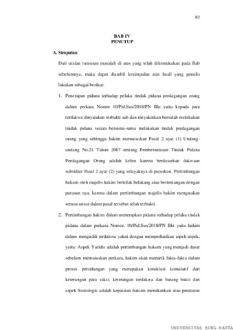 ABSTRAK PENERAPAN PIDANA TERHADAP PELAKU TINDAK PIDANA PERDAGANGAN ORANG ( HUMAN TRAFFICKING ) ( Studi Putusan Nomor. 10/Pid.Sus/2018/PN.Bkt ). Tri Andika Hidayatullah , Program Studi Ilmu Hukum, Fakutas Hukum, Universitas Bung Hatta, E-mail: andikahidayatullah26@gmail.com 1 , Yetisma Saini 1 , Syfridatati 1 Perdagangan orang diatur di Pasal 2 ayat (1) dan Pasal 2 ayat (2) Undang-undang Nomor 21 tahun 2007 tentang Pemberantasan Tindak Pidana Perdagangan Orang. Putusan perkara Nomor. 10/Pid.Sus/2018/PN telah dinyatakan pelaku bersalah dan diancam hukuman 5 tahun penjara dan denda Rp.200.000.000 tindak pidana mengekploitasi seseorang untuk memperkerjakan sebagai pekerja seks komersial (PSK). (1). Bagaimanakah penerapan pidana terhadap pelaku tindak pidana perdagangan orang dalam perkara Nomor 10/Pid.Sus/2018/PN Bkt ? (2). Bagaimanakah pertimbangan hakim dalam menerapkan pidana terhadap pelaku tindak pidana dalam perkara Nomor. 10/Pid.Sus/2018/PN Bkt ? Jenis Penelitian yang digunakan penelitian hukum normatif, sumber data yang dipakai adalah data sekunder terdiri dari bahan hukum primer, sekunder, dan tersier dengan teknik pengumpulan data studi dokumen, data dianalisa secara kualitatif . Simpulan penelitian (1) Penerapan pidana terhadap pelaku tindak pidana perdagangan orang dalam perkara Nomor 10/Pid.Sus/2018/PN Bkt Pasal yang diterapkan tidak sesuai dimana pasal yang seharusnya diterapkan yaitu Pasal 2 ayat (2). (2) Pertimbangan hakim dalam menerapkan pidana terhadap pelaku tindak pidana dalam perkara Nomor. 10/Pid.Sus/2018/PN Bkt menurut aspek yuridis yaitu fakta-fakta, keterangan saksi, terdakwa dan barnag bukti yang terungkap di persidangan dan aspek sosiologis ada hal yang meringankan seperti mengakui perbuatan dan yang memberatkan seperti pelanggaran Hak Asasi Manusia Keyword : Penerapan, Pidana, Perdagangan, Orang.