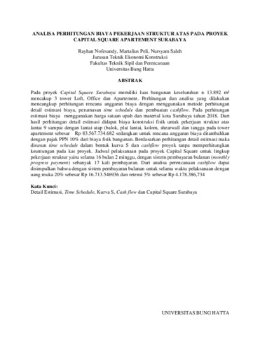 Rayhan, Nofesandy and Martalius, Peli and Nursyam, Saleh (2020) ANALISA PERHITUNGAN BIAYA PEKERJAAN STRUKTUR ATAS PADA PROYEK CAPITAL SQUARE APARTEMENT SURABAYA. Diploma thesis, UNIVERSITAS BUNG HATTA.