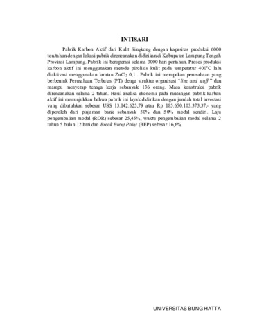 Pabrik Karbon Aktif dari Kulit Singkong dengan kapasitas produksi 6000 ton/tahun dengan lokasi pabrik direncanakan didirikan di Kabupaten Lampung Tengah Provinsi Lampung. Pabrik ini beroperasi selama 3000 hari pertahun. Proses produksi karbon aktif ini menggunakan metode pirolisis kulit pada temperatur 400oC lalu diaktivasi menggunakan larutan ZnCl2 0,1 . Pabrik ini merupakan perusahaan yang berbentuk Perusahaan Terbatas (PT) denga struktur organisasi “line and staff ” dan mampu menyerap tenaga kerja sebanyak 136 orang. Masa konstruksi pabrik direncanakan selama 2 tahun. Hasil analisa ekonomi pada rancangan pabrik karbon aktif ini menunjukkan bahwa pabrik ini layak didirikan dengan jumlah total investasi yang dibutuhkan sebesar US$ 13.142.625,79 atau Rp 185.650.103.373,37,- yang diperoleh dari pinjaman bank sebanyak 50% dan 50% modal sendiri. Laju pengembalian modal (ROR) sebesar 25,45%, waktu pengembalian modal selama 2 tahun 5 bulan 12 hari dan Break Event Point (BEP) sebesar 16,6%.