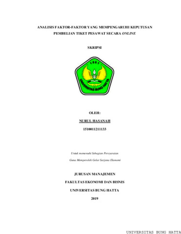 ANALISIS FAKTOR-FAKTOR YANG MEMPENGARUHI KEPUTUSAN PEMBELIAN TIKET PESAWAT SECARA ONLINE Nurul Hasanah1, Lindawati2, Mery Trianita3 Jurusan Manajemen, Fakultas Ekonomi dan Bisnis, Universitas Bung Hatta E-mail: hasanahnurul887@gmail, lindawati@bunghatta.ac.id ABSTRAK Penelitian ini bertujuan untuk mengetahui faktor-faktor yang mendorong konsumen dalam pengambilan keputusan pembelian secara tiket pesawat secara online, serta untuk mengetahui apakah akan terdapat perbedaan pengambilan keputusan pembelian tiket pesawat secara online. Populasi dalam penelitian ini adalah seluruh pembeli yang menggunakan situs tiket pesawat secara online yang tidak diketahui dengan pasti jumlahnya, dengan jumlah sampel 138 orang. Metode pengambilan sampel dalam penelitian ini adalah purposive sampling. Jenis data yang digunakan adalah data primer melalui penyebaran kuesioner. Metode analisa data yang digunakan adalah uji chi square test. Hasil penelitian ini menemukan bahwa terdapat dua faktor, faktor pertama diberi nama keunggulan pembelian tiket pesawat secara online dengan enam item pernyataan kepercayaan terhadap situs tiket pesawat secara online, kemudahan transaksi dalam situs tiket pesawat secara online, kualitas informasi yang memadai, presepsi yang positif terhadap situs tiket pesawat secara online, Tampilan website yang mudah dipahami, dan pelayan yang cepat tanggap. Faktor kedua diberinama kemudahan pembelian tiket pesawat secara online dengan empat item pernyataan gaya hidup yang semakin meningkat, sistem pemesanan yang mudah,dapat menghemat waktu sat pembelian tiket pesawat secara online, serta dapat melakukan transaksi online dimana saja. Kata Kunci : Faktor-Faktor Yang Mempengaruhi Keputusan Pembelian